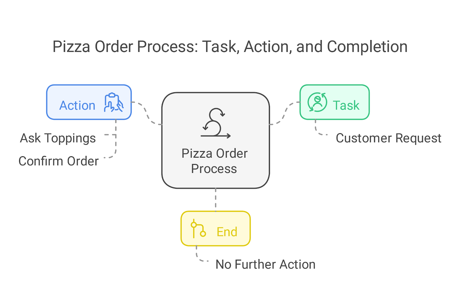 - Action: Asks "What toppings?" → Confirms order.